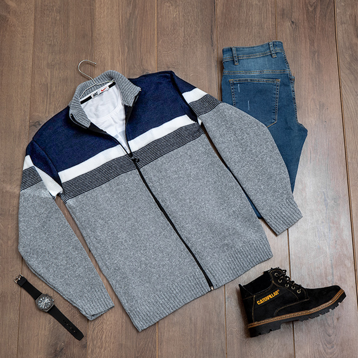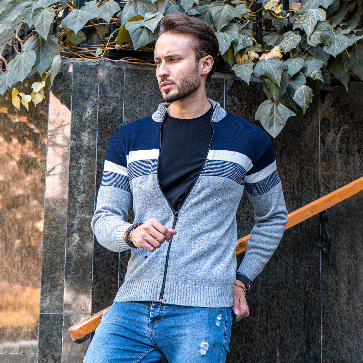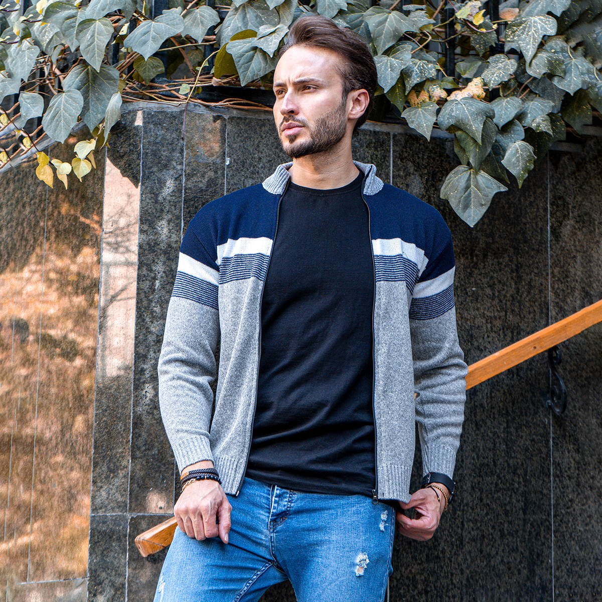 بافت مردانه زیپ دار دورنگ آبی طوسی مدل shadima