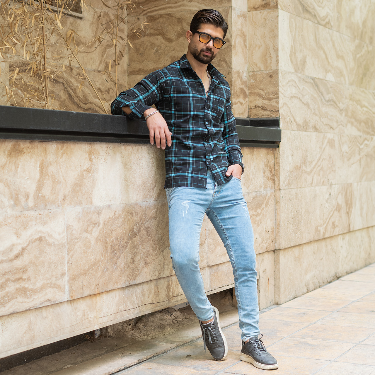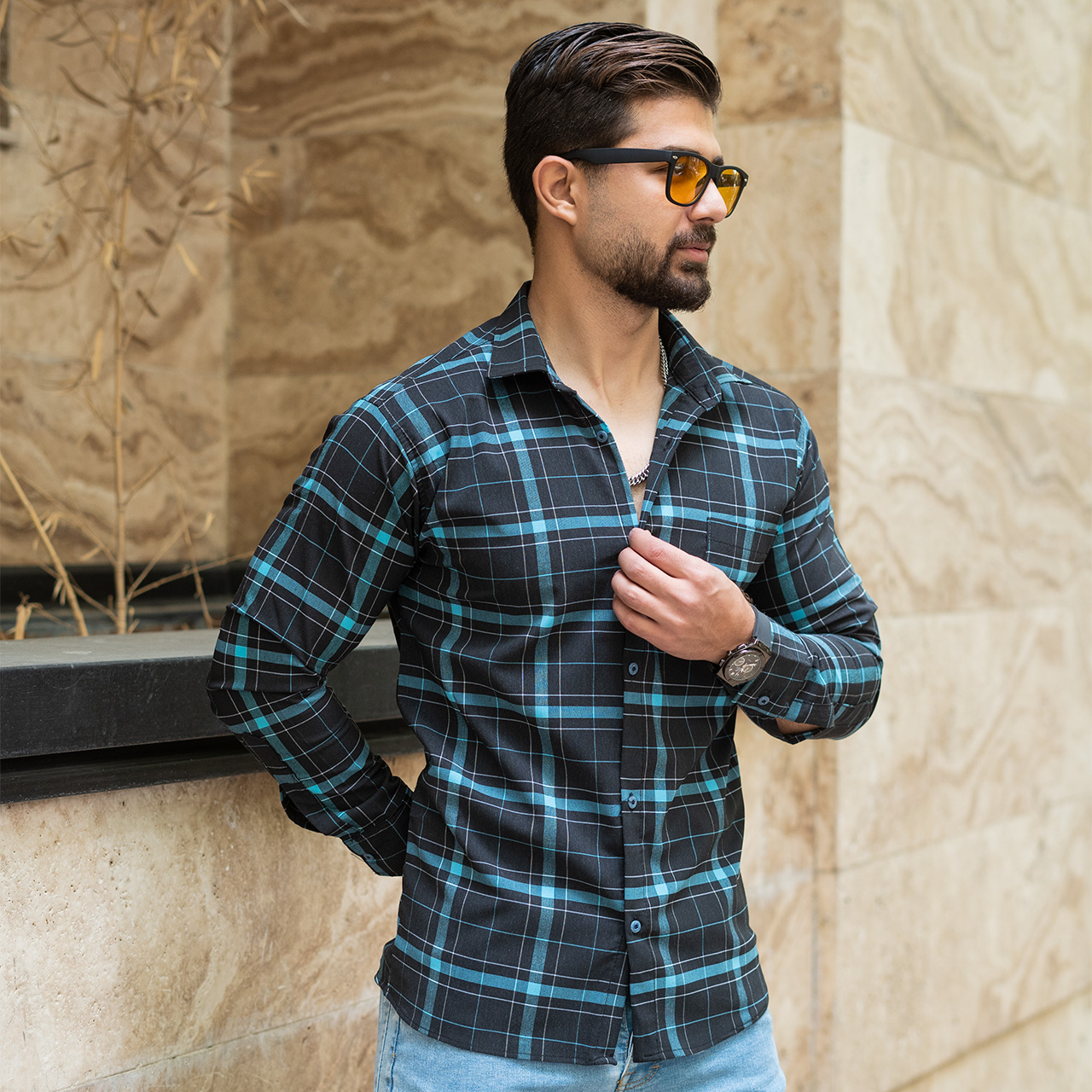 پیراهن مکعبی (T)مشکی آبی مردانه مدل faron