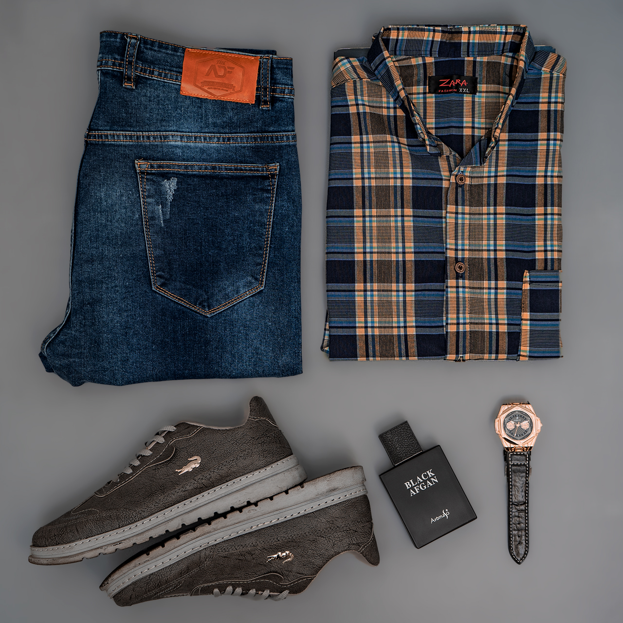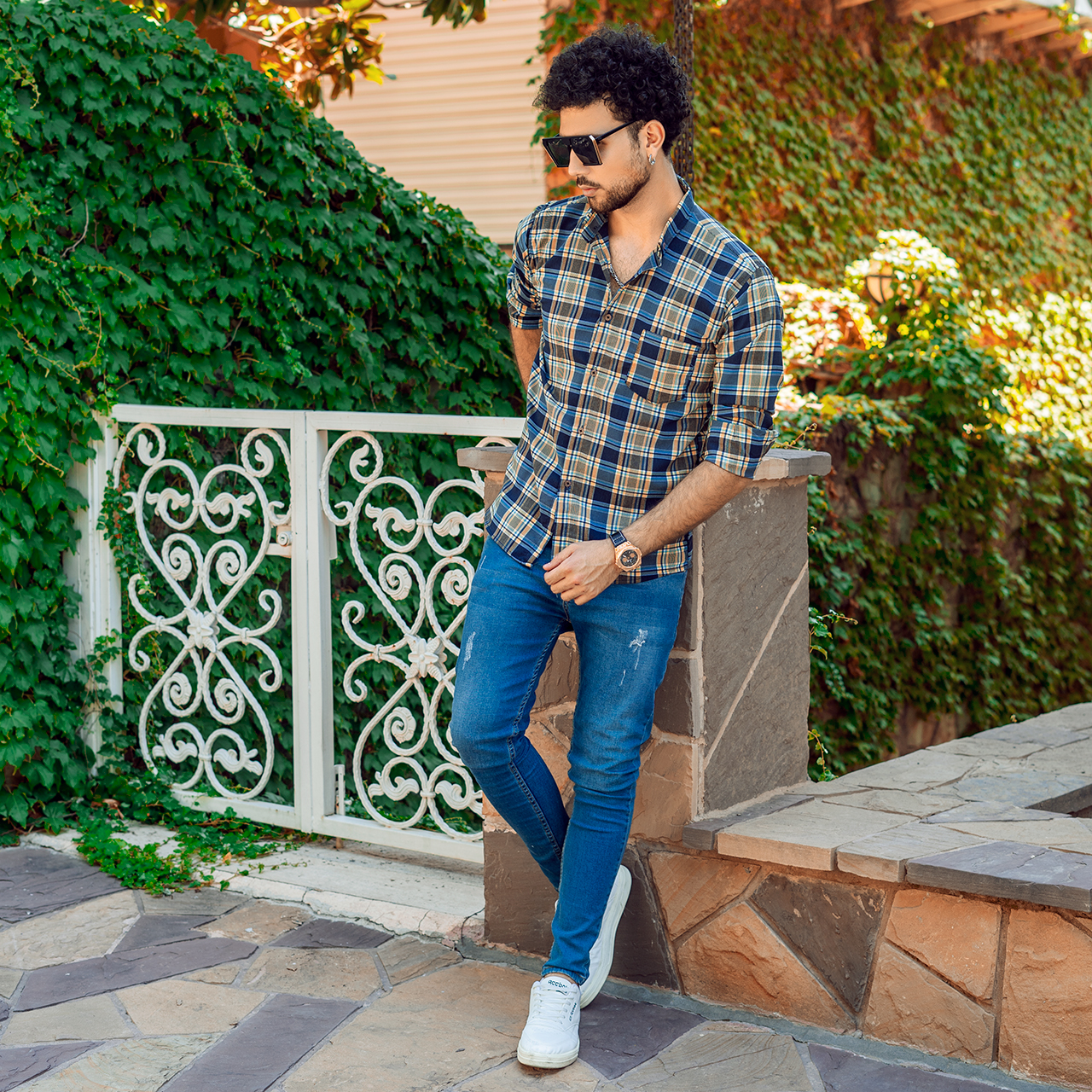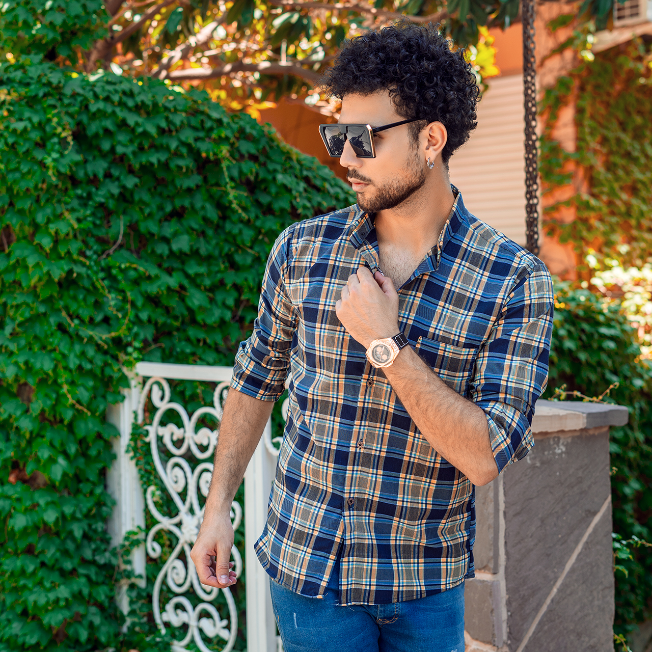 پیراهن چهارخونه مردانه آبی زرد مدل B14
